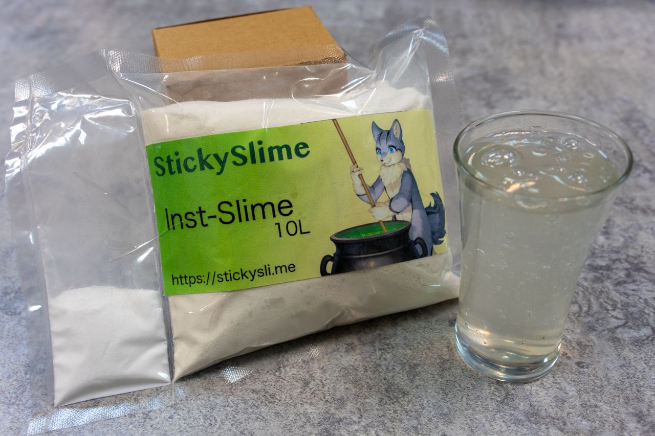 - Inst-Slimeを開封し、水に振りかけながら約2分間かき混ぜ続け(30秒以内にすべての粉末を水に混ぜてください)